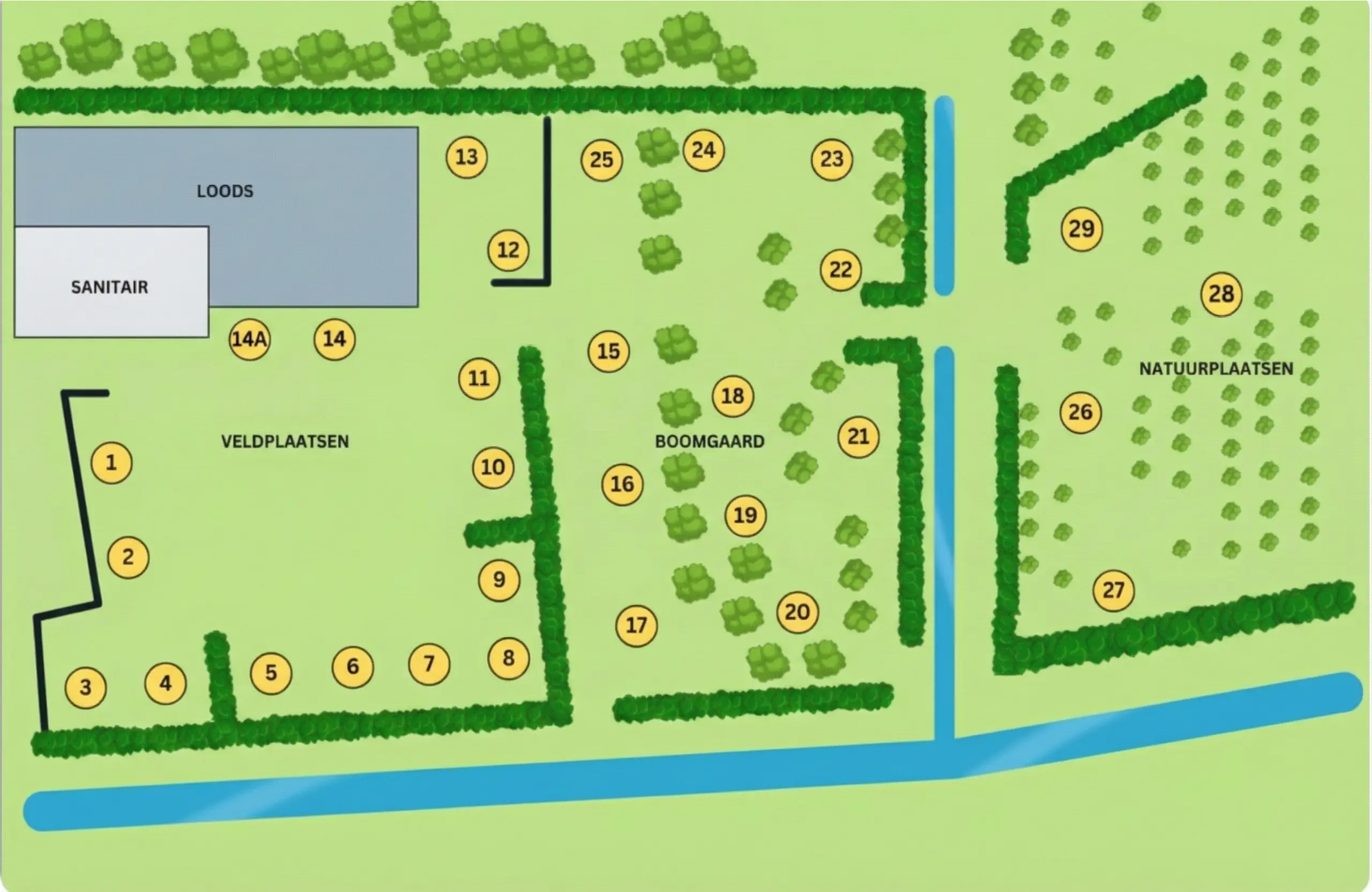 Boomgaard In de boomgaard zijn 11 zeer riante kampeerplaatsen ingericht tussen de 25 jaar oude pruimenbomen. Iedere kampeerplaats heeft iets bijzonders, blijkt uit de reacties van de kampeerders én de voorkeuren die ieder heeft voor en bepaalde plaats. "Genieten met een grote G" is één van de ervaringen die één van de kampeerders met ons deelde. In de nieuwe boomgaard, die in 2012 is aangepland, zijn 4 natuurplaatsen ingericht. Super grote plaatsen waar verbinding met de natuur een grote rol speelt. We reserveren deze natuurplaatsen niet voor gezinnen met kinderen en honden zijn er niet toegestaan.